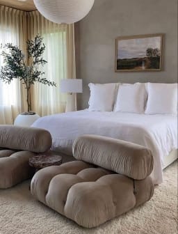 This studio layout works because every piece has a clear function and visual weight. Tall curtains draw the eye upward, while low furniture keeps the sightlines open and the room feeling calm.⁠